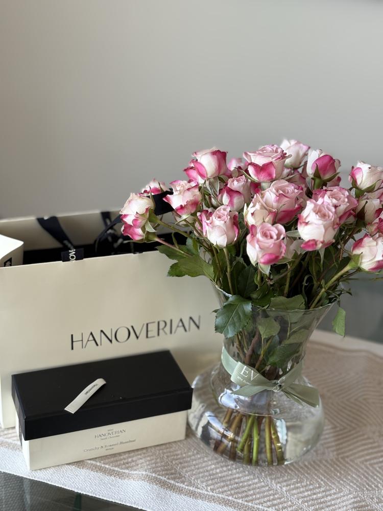 فازة ورد جوري مع بوكس شوكلاته هنوفيرين 6 قطع
